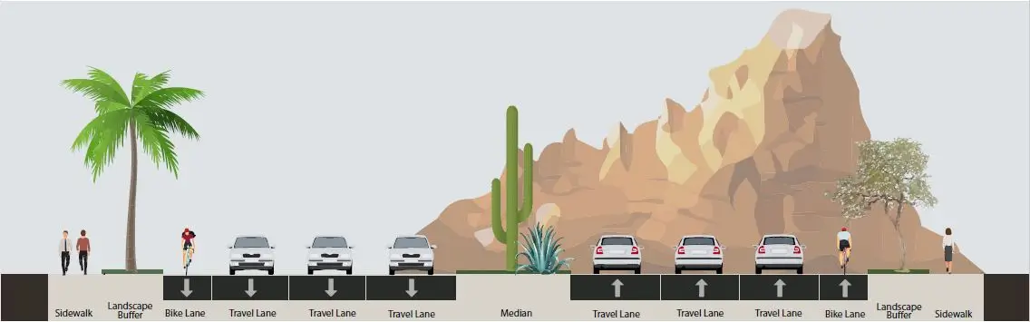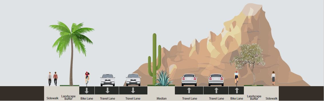 Complete Streets: Provide sufficient right-of-way and design, operate, and maintain Scottsdale's streets to promote safe and convenient access and travel for users of all types: pedestrians; mobility assisted; bicyclists; transit vehicles and riders; equestrians; cars; and trucks. Provide facilities and amenities that are recognized as contributing to complete streets, including roadway and pedestrian level street lighting; pedestrian and bicycle safety improvements; access improvements in accordance with ADA; transit facilities accommodation, including but not limited to pedestrian access improvement to transit stops; street trees and landscaping; and street furnishings that are sensitive to the local context.