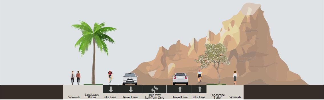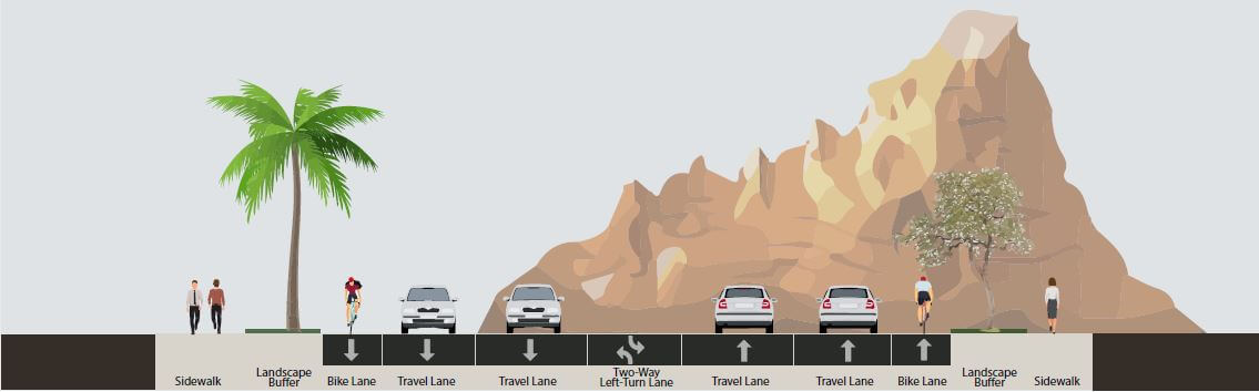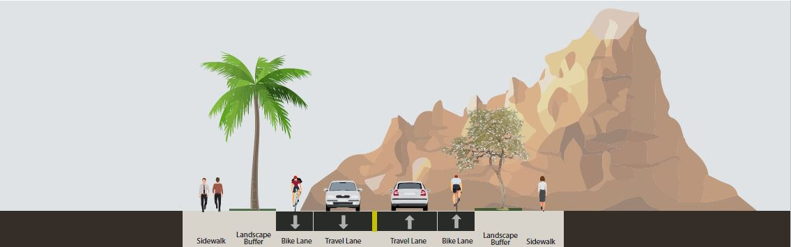 Over the years, some streets were built with too many lanes based on anticipated development patterns that ultimately did not occur. On other streets, creation of the McDowell Sonoran Preserve reduced capacity needs. In all, thirty-two lane miles can be converted to non-auto uses by restriping or narrowing the street. Narrowing the distance between the outside curbs will be considered when the remaining travel lanes will continue to operate at 75% or less of capacity (7,500-10,000 vehicles per lane per day, depending on number of lanes, land use and access conditions).